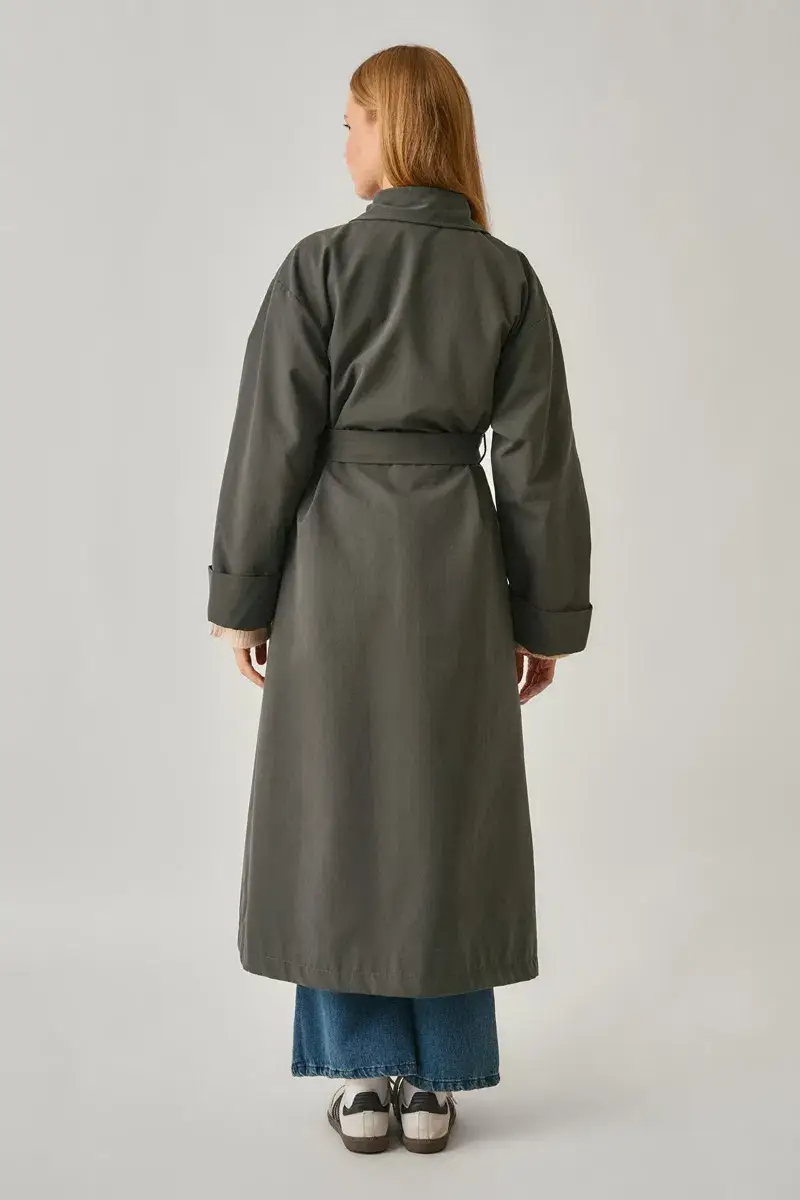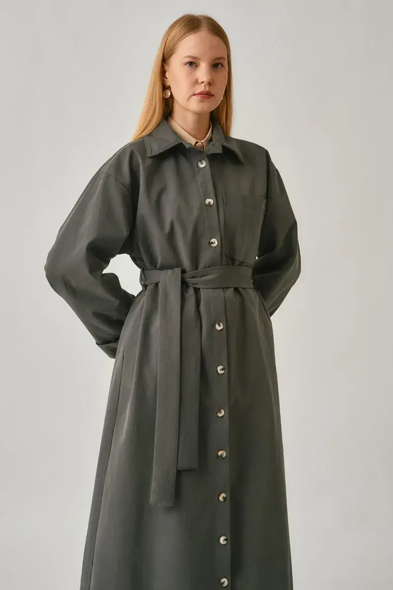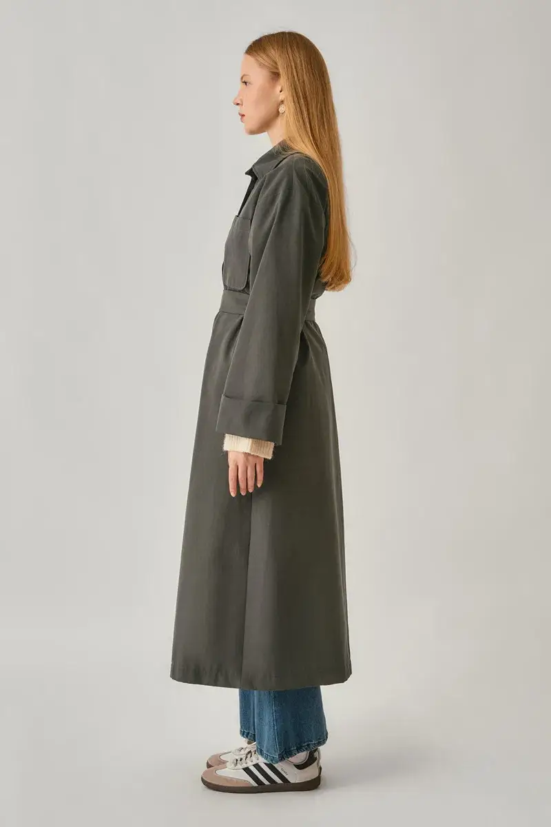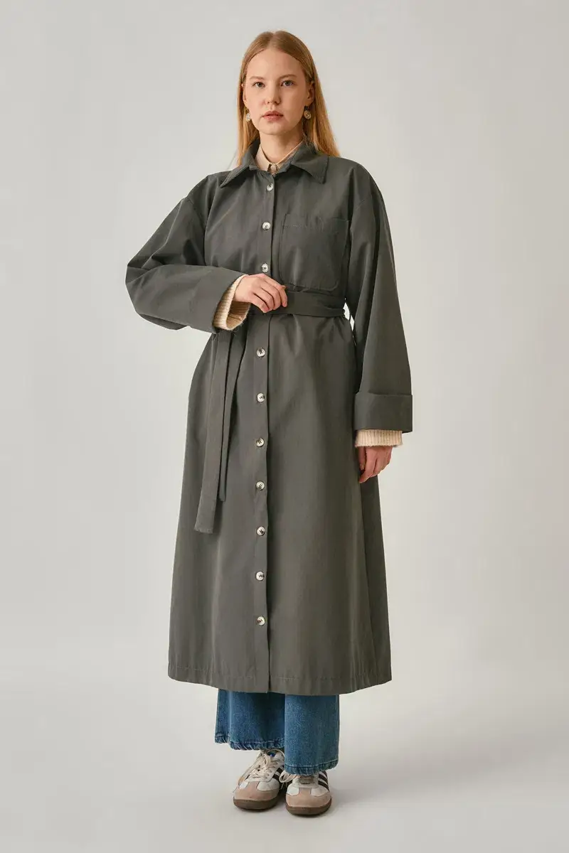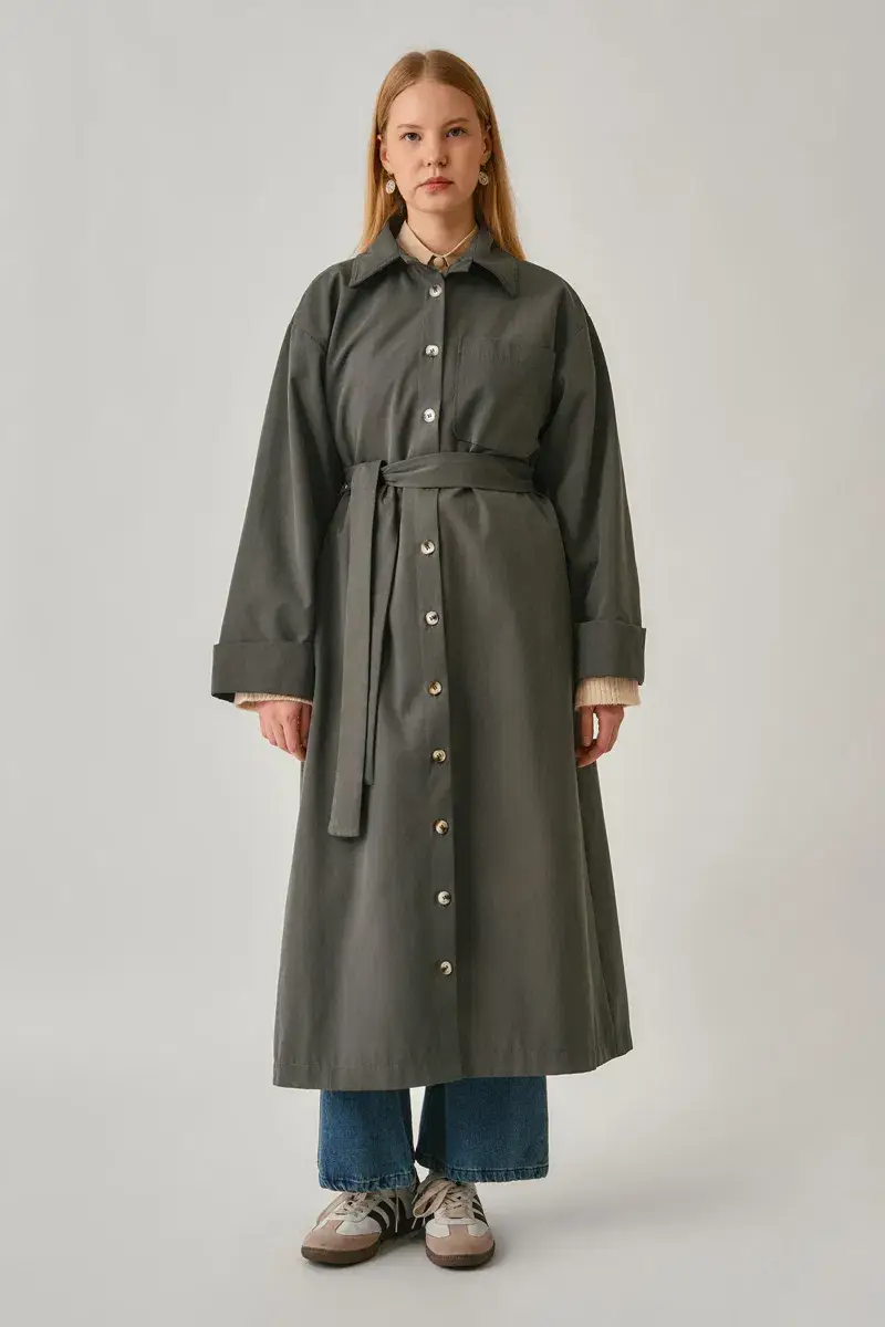 Düğmeli Uzun Trençkot Antrasit, sade çizgileri ve zamansız tasarımıyla her sezon gardırobunuzun en değerli parçalarından biri olmaya aday. Düğmeli ön tasarımı ve düz formu ile klasik trençkot görünümünü korurken, bel kısmındaki bağlama detayı sayesinde silueti şekillendirir ve feminen bir duruş kazandırır. Uzun boyu, mevsim geçişlerinde maksimum koruma ve konfor sunarken günlük stilinize şık bir dokunuş katmak için ideal bir parçadır.