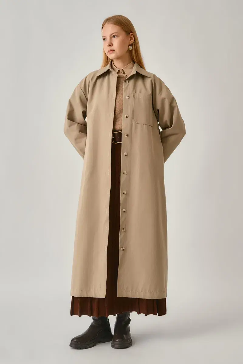 Düğmeli Uzun Trençkot Antrasit, sade çizgileri ve zamansız tasarımıyla her sezon gardırobunuzun en değerli parçalarından biri olmaya aday. Düğmeli ön tasarımı ve düz formu ile klasik trençkot görünümünü korurken, bel kısmındaki bağlama detayı sayesinde silueti şekillendirir ve feminen bir duruş kazandırır. Uzun boyu, mevsim geçişlerinde maksimum koruma ve konfor sunarken günlük stilinize şık bir dokunuş katmak için ideal bir parçadır.