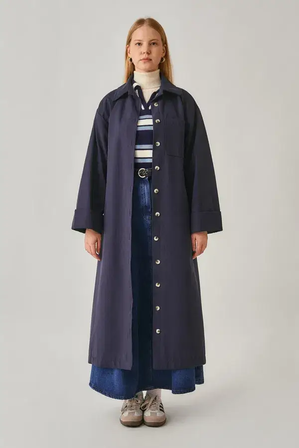 Düğmeli Uzun Trençkot Lacivert